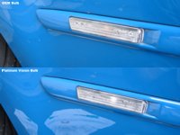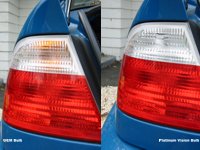 This is solely my opinion, but I think these bulbs are a hazard to your health. There is no way that anyone will see your turn signal during daylight unless they are 10 feet away from your car. I am hardly the most safety conscious person you will find but after installing the bulbs and turning on the turn signals on an overcast day to see how they work, I took all the of the Platinum Vision bulbs out and asked for a refund. But, before I pulled them out I shot a series of short movies comparing OEM bulb brightness with Platinum Visions'. Please refer to the links below to start the movies (they range in size from 500k to 3mb). All of the movies (with the exception of one) were shot around 3 PM on an overcast day. The night comparison was shot about an hour after sunset. Comparisons were shot within 5-10 minutes of each other so the lighting conditions were identical. To give the Platinum Visions a benefit of doubt, I shot the movies from the side that had Platinum Visions mounted with the unpainted section pointing out - the other side's bulbs appeared about 25% dimmer then this side (talk about a stupid design either way). Watch the comparisons, realize that the camera actually accentuates light sources (making bulbs appear brighter) and then decide if your life is worth the risk.